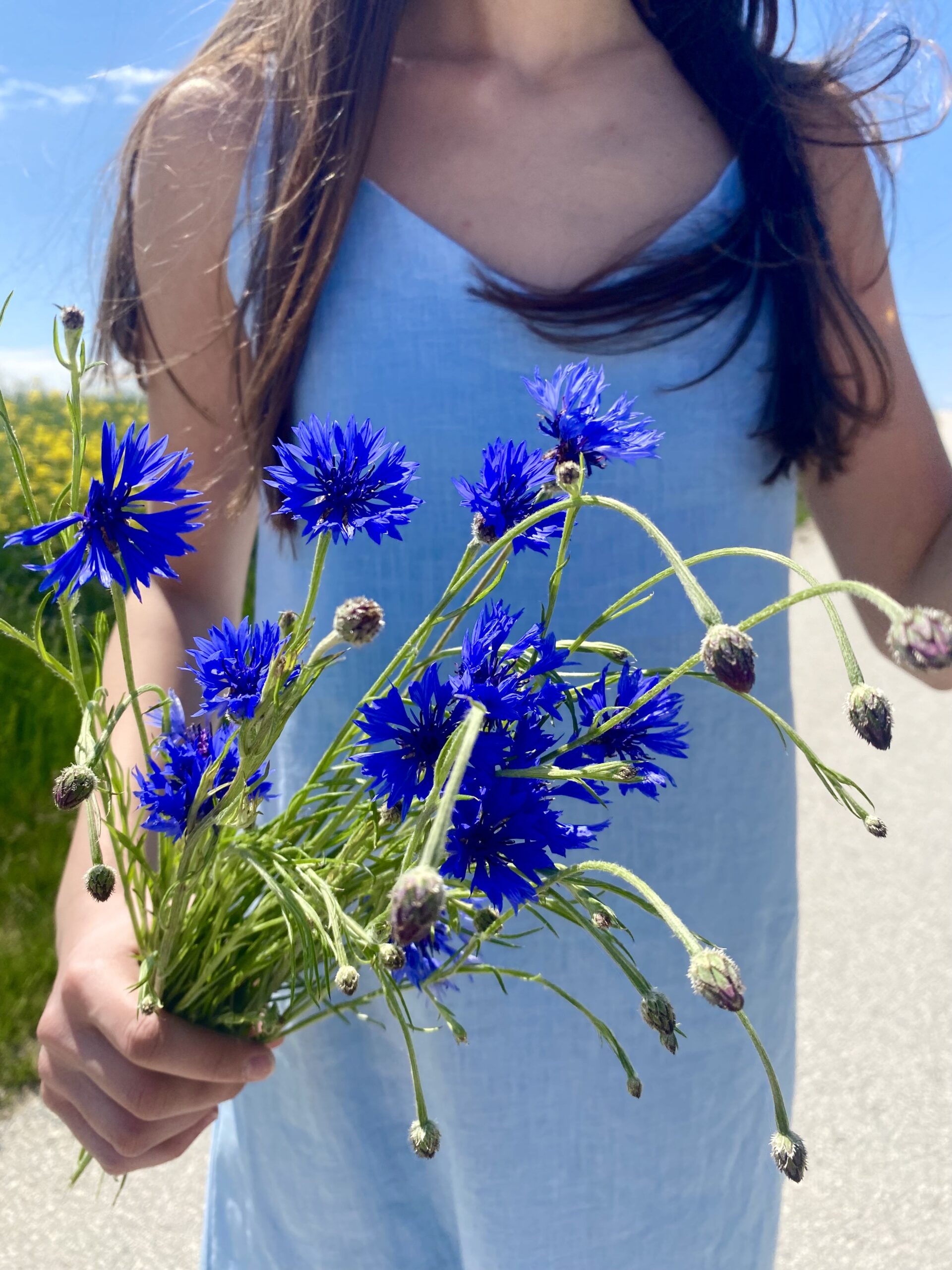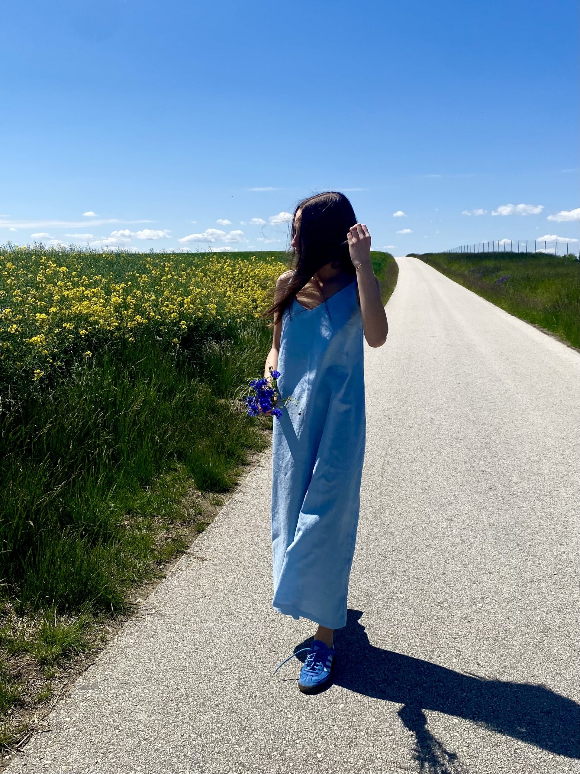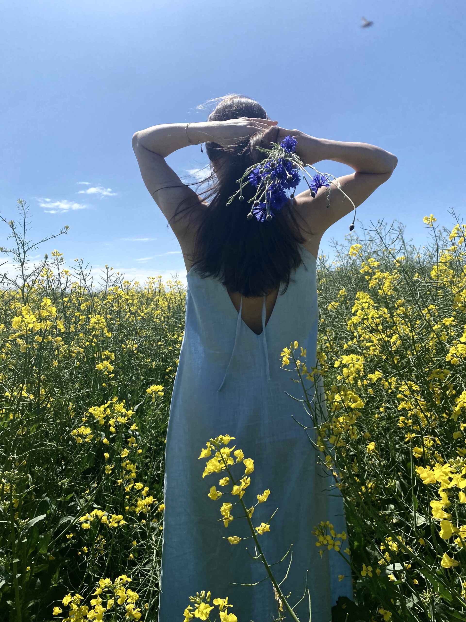 Sukienka z miękkiego lnu. Może być w kolorze żółtym masełkowym lub niebieskim. Dekolt z tyłu na plecach. Wiązana na plecach dzięki czemu możesz sama wyregulować długość ramiączek.  Pięknie się układa. Bardzo kobieca. Poczujesz się cudownie , zwiewnie mając na sobie tkaninę o cudownych właściwościach idealną na upalne dni w mieście lub na wakacjach.