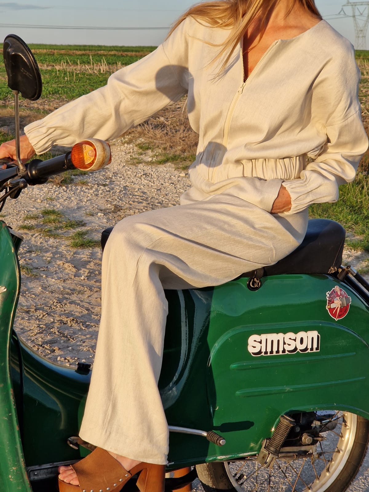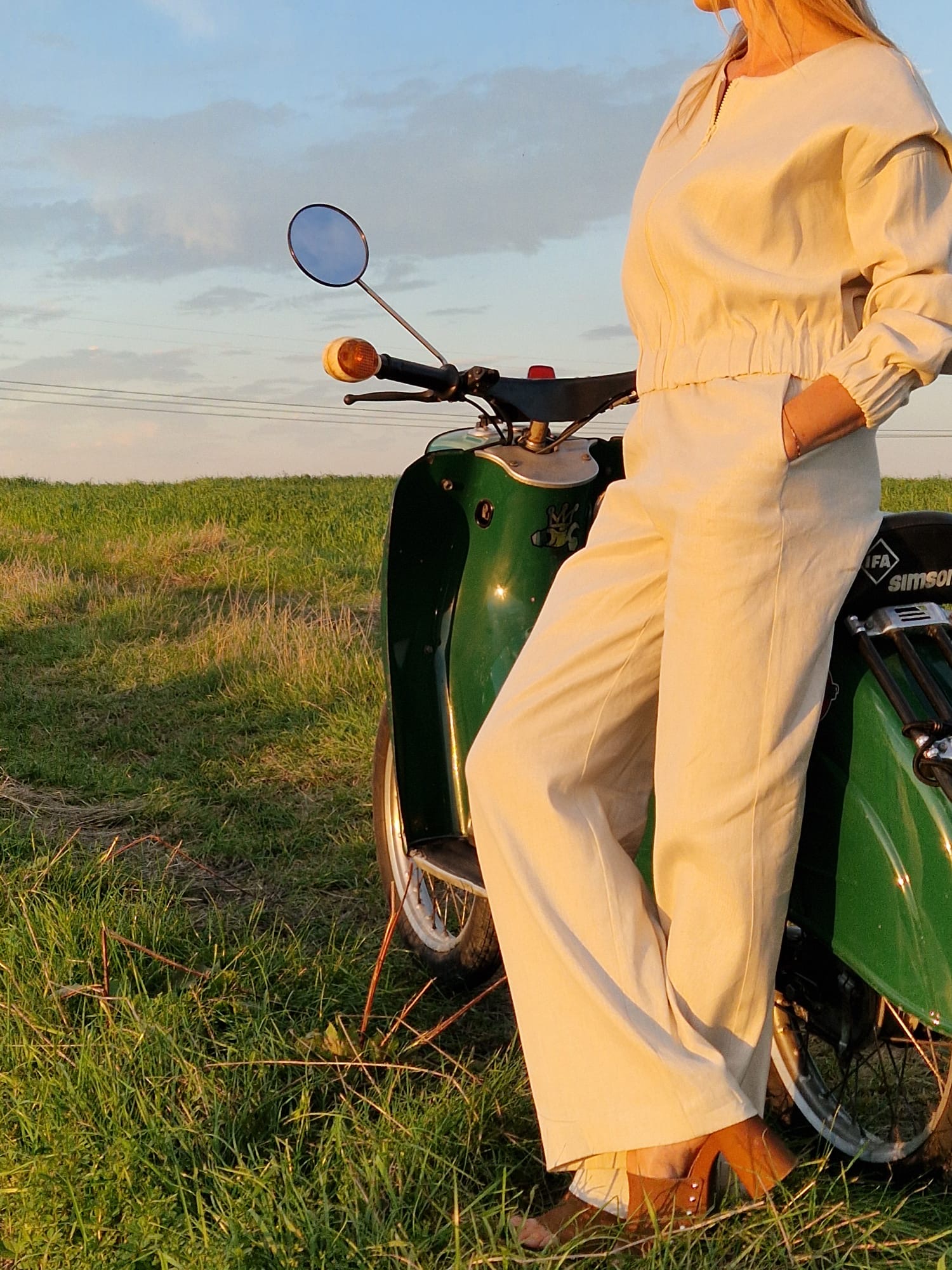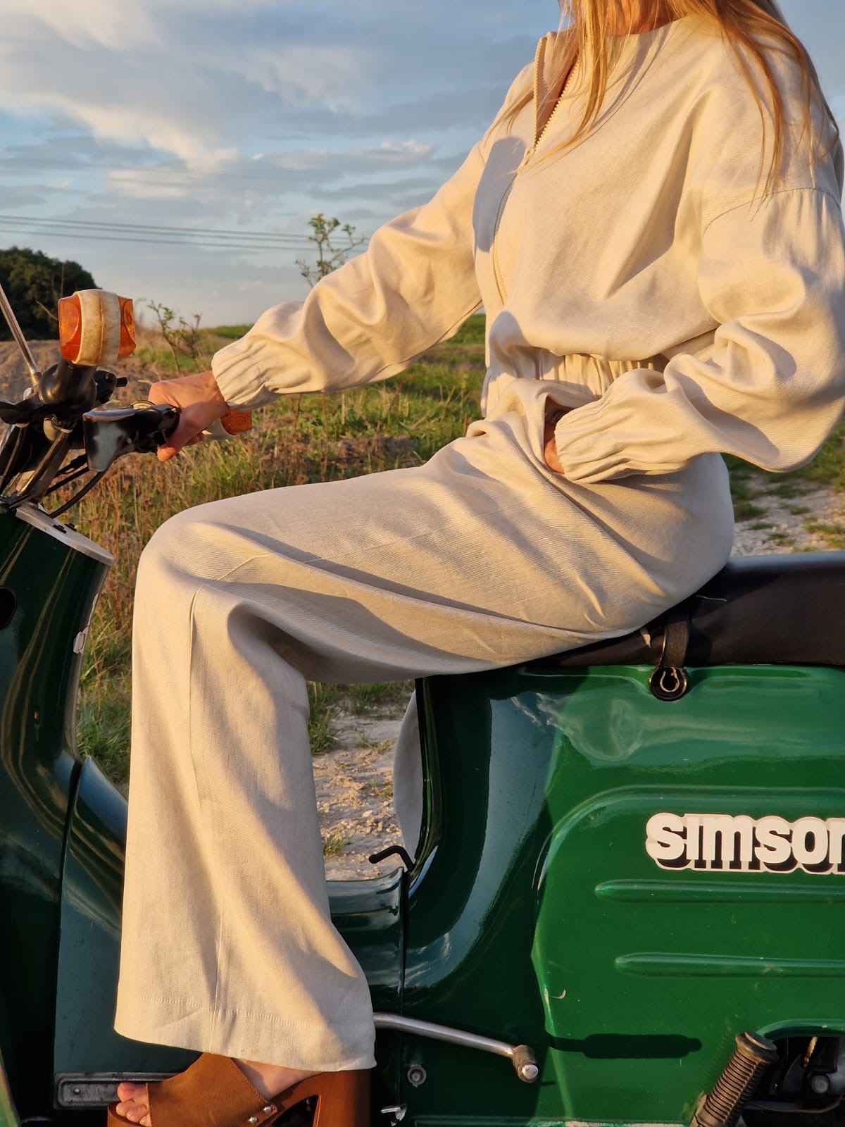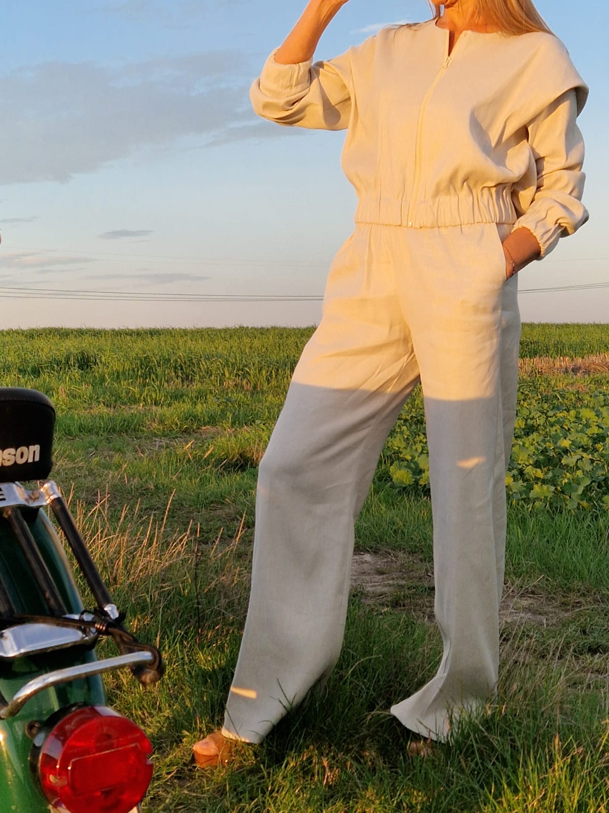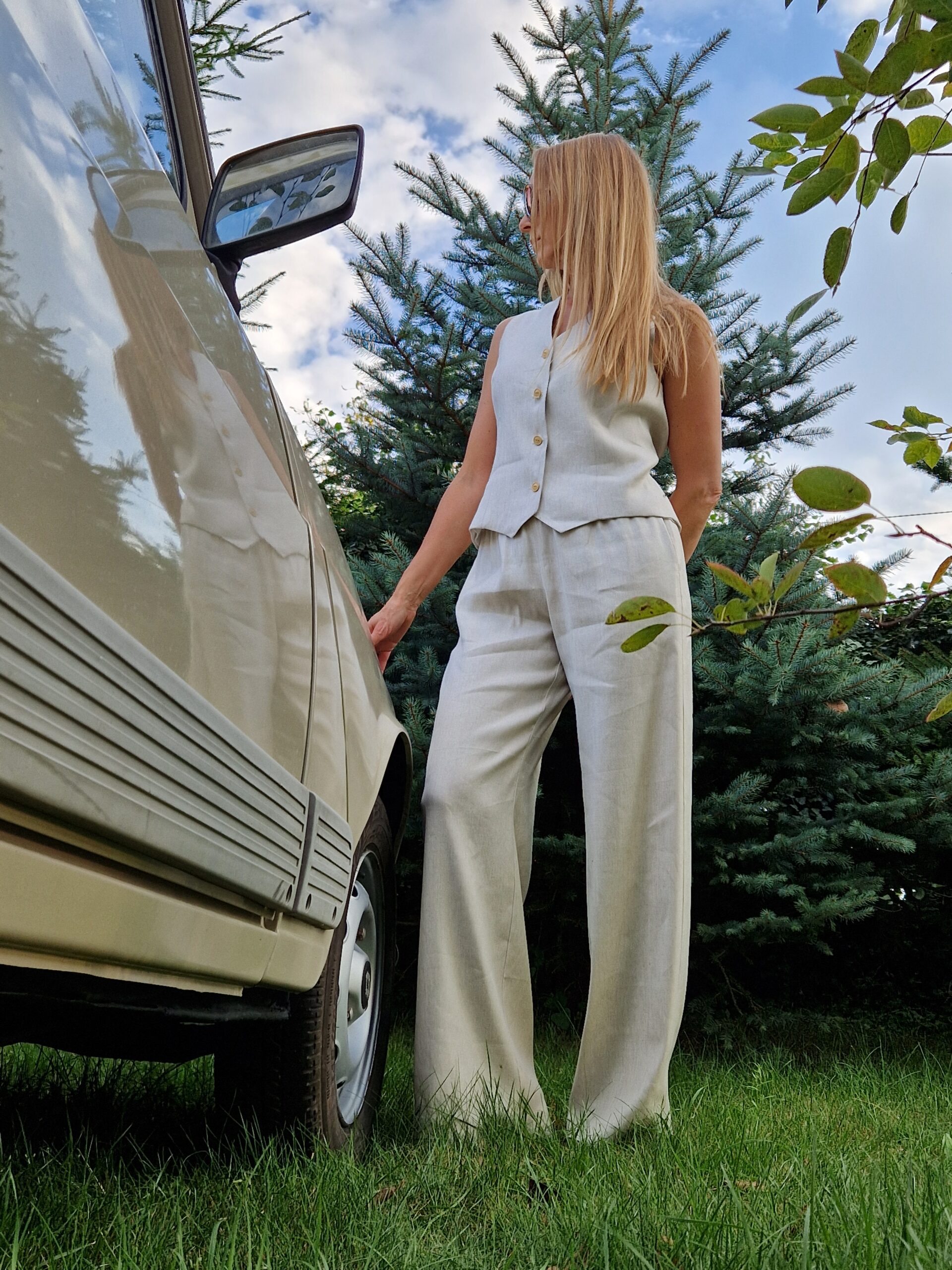 kamizelka i spodnie kremowa na przyjęcie, damski zestaw garniturowy, set lniany kremowy, odzież damska z lnu, letnie stylizacje damskie, szerokie spodnie lniane , elegancki zestaw z lnu, ubrania z lnu na specjalne okazje, sklep internetowy z odzieżą damską, ubranie z lnu, polska marka odzieżowa, moda damska z lnu na lato